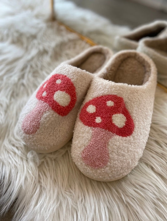 Home Slippers Red Heart Mushroom Pattern Slides Ladies Winter Indoor Flat Warm House Plush Slippers